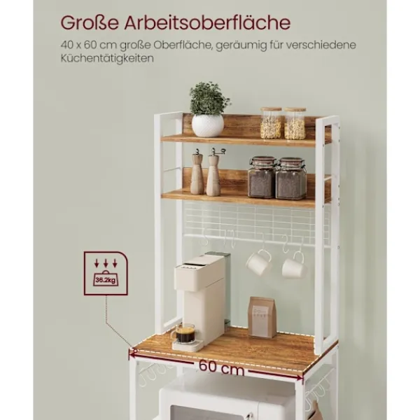 Med flera hyllor och krokar erbjuder detta köksställ omfattande förvaringsmöjligheter. Den är perfekt för att förvara kastruller, stekpannor, husgeråd och till och med dekorativa föremål, vilket håller ditt kök snyggt och snyggt.
