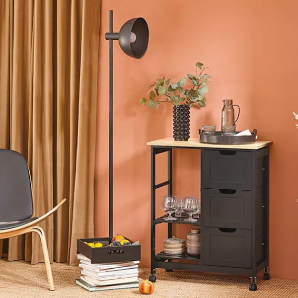 Rootz Kitchen Trolley är en idealisk lösning för ytterligare förvaring och organisation i ditt kök. Den är mångsidig och hållbar. Vagnen är utrustad med 3 stora lådor och 3 löstagbara hyllor för snabb åtkomst till redskap. Dess 4 hjul (2 med stoppare) gör den lätt att flytta och styra, även i trånga utrymmen. Finns i vit, svart eller ljusgrå.