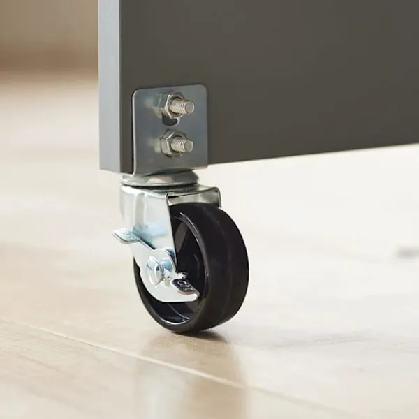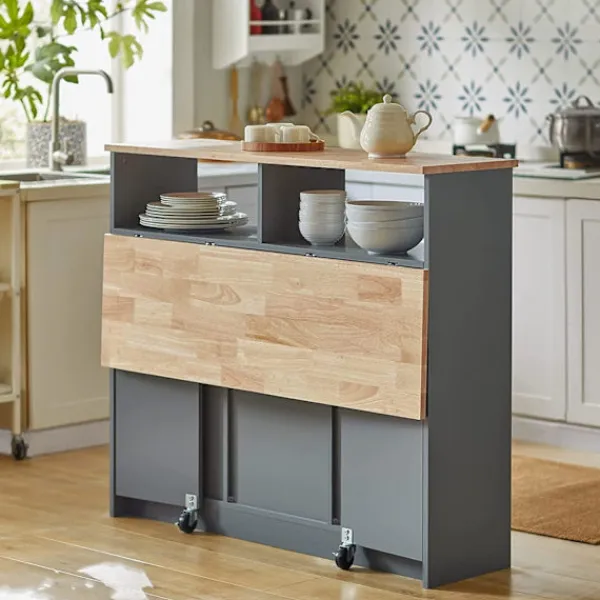 - Det finns en vikbar bänkskiva bakom skänken. Hjulen på undersidan av ramen gör att du enkelt expanderar eller fäller ihop den extra bänkskivan.