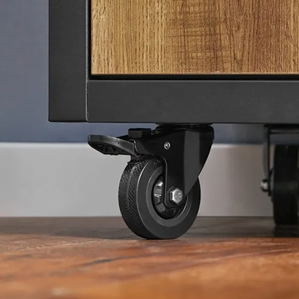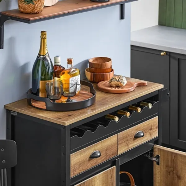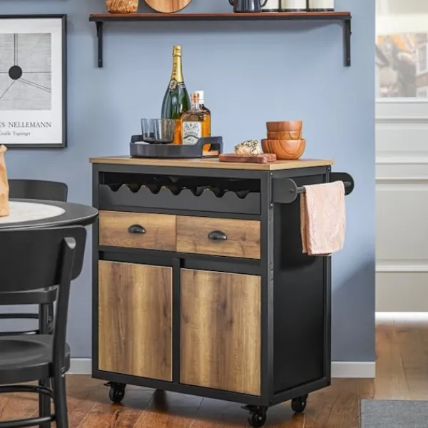Denna mångsidiga köksvagn erbjuder gott om förvaringsutrymme med två dörrar, två lådor, ett handduksställ och ett flaskställ. Den utdragbara flaskhyllan ger enkel åtkomst medan de fyra flexibla hjulen säkerställer smidig transport.