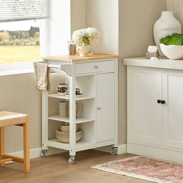 Utrustad med en låda, tre hyllor och ett rymligt skåp, ger den här köksvagnen generöst utrymme för att förvara redskap, porslin och mer, och håller dina väsentligheter organiserade och tillgängliga.