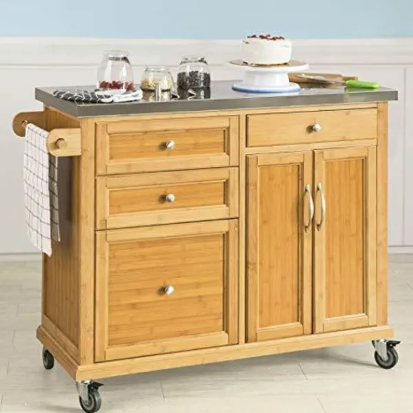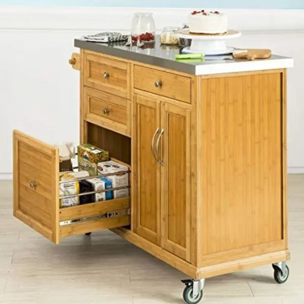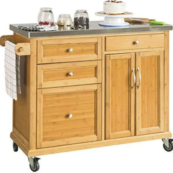 Detaljer: Denna moderna extraordinära köksvagn är designad för olika förvaringsutrymmen och hållbar användning. Den har en bänkskiva i rostfritt stål, 4 lådor, 1 skåp med invändig justerbar hylla, 1 handdukshängare och 4 hjul (2 med broms). Bänkskivan av god kvalitet MDF och rostfritt stål ger gott om plats att förvara och laga mat. Med 4 hjul (2 hjul med bromsfunktion) kan du enkelt flytta runt vagnen i ditt kök. Med denna vagn skulle ditt hem bli mer stilfullt och rymligt. Produktinformation Material: Bambu, MDF, spånskiva, metall. Mått: B115 x D46 x H92cm. Bänkskivans storlek: 107x46cm. Vikt: 38kg. Lastkapacitet: 100 kg. Varan kommer i 2 platta förpackningar och kräver självmontering. Detaljerade instruktioner medföljer. Vi beklagar att vi inte kan garantera att båda paketen levereras samtidigt. Vänligen börja montera efter att båda förpackningarna har levererats. De dekorativa elementen ingår inte i leveransen. Vänligen kontakta oss via e-post när du har några frågor, vi svarar så snart som möjligt!