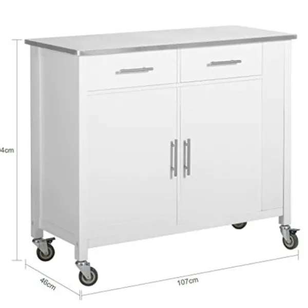 - Den har en bänkskiva i rostfritt stål, 2 lådor, 1 skåp med 2 invändiga justerbara hyllor, 3 sidohyllor, 1 hushållsrullehållare och 4 hjul.