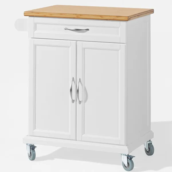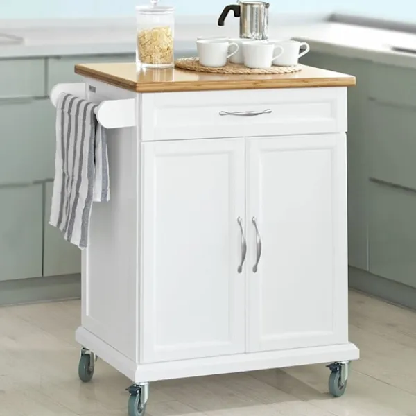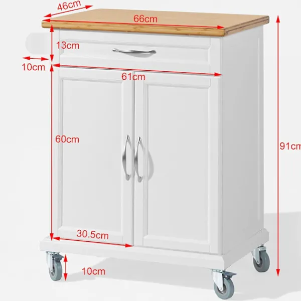 Detaljer: Superbekvämt köksskåp är perfekt för ditt kök, pentry eller var du än behöver extra förvaringsutrymme för redskap. Produktegenskaper Modern design Stabil och hållbar Olika förvaringsmöjligheter Bänkskiva i bambu 1 låda 1 skåp 1 handdukstork 4 gummihjul, 2 med bromsar Produktinformation Material: Massivt trä, MDF, bambu. Färg: Vit + Natur. Mått: B66 x D46 x H91cm. Bänkskiva Storlek: B66 x D46cm. Vikt: 23,5 kg. Lastkapacitet: 80 kg. Varan levereras platt packad och kräver enkel montering. Detaljerade instruktioner medföljer. De dekorativa elementen ingår inte i leveransen. Vänligen kontakta oss via e-post när du har några frågor, vi svarar så snart som möjligt!