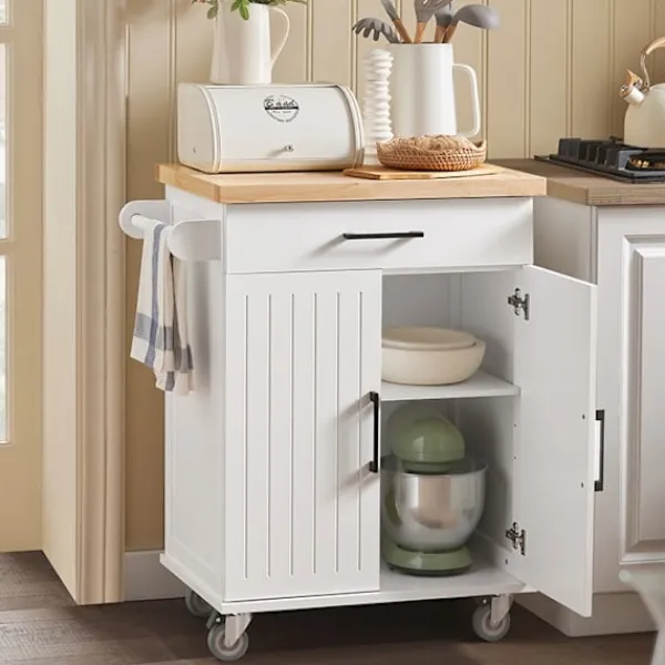 Vagnen har en justerbar hylla bakom dörrarna, så att du kan anpassa förvaringsutrymmet för att passa föremål i olika storlekar, från stora krukor till små kryddor, vilket förbättrar din köksorganisation.