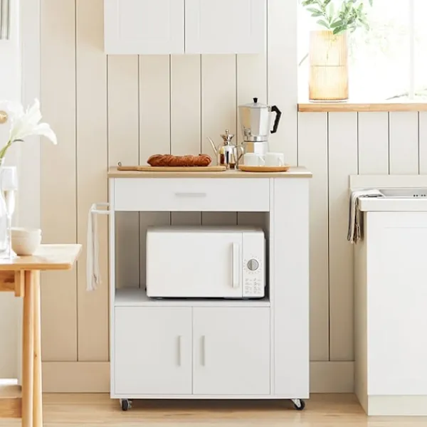 Utrustad med fyra robusta hjul, varav två har stopp, kan denna köksvagn enkelt flyttas runt ditt kök eller matplats, vilket säkerställer att allt du behöver alltid finns inom räckhåll.