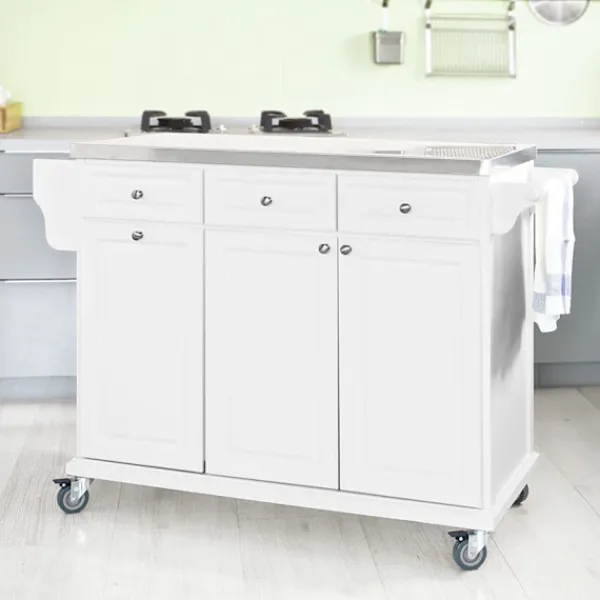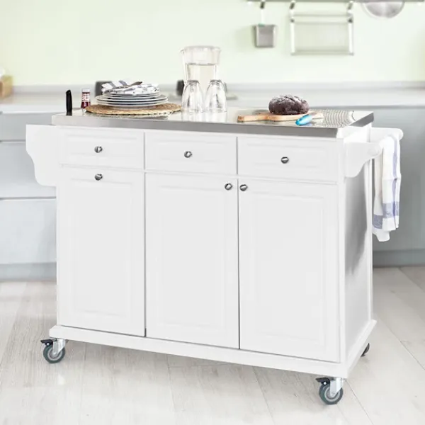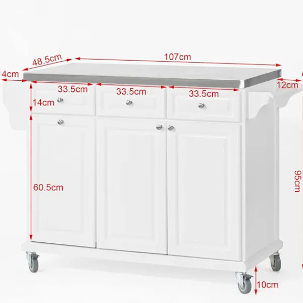 Detaljer: Helt ny lyxköksvagn är designad för lång livslängd. Superbekvämt köksförvaringsskåp är perfekt för köket eller andra rum i ditt hus som behöver lite extra förvaring. Produktegenskaper Modern och vacker design. Stabil och hållbar. Olika förvaringsalternativ. Bänkskiva i rostfritt stål. 3 Utility-lådor. 1 stort skåp med justerbar hylla. 1 djupt skåp för soptunna. 1 Handdukstork. 1 litet sidoförvaringsställ. 4 gummihjul, två med broms. Produktinformation Mått: B133 x D48,5 x H95cm; Bänkskiva Storlek: B107x D48,5cm; Material: Bänkskiva i rostfritt stål/lövträ/MDF/spånskiva; Färg vit; Produktvikt: 47 KGS; Lastkapacitet: 50 KGS. Varan kommer i 2 platta förpackningar och kräver självmontering. Detaljerade instruktioner medföljer. Vi beklagar att vi inte kan garantera att båda paketen levereras samtidigt. Vänligen börja montera efter att båda förpackningarna har levererats. De dekorativa elementen ingår inte i paketet. Vänligen kontakta oss via e-post när du har några frågor, vi svarar så snart som möjligt!