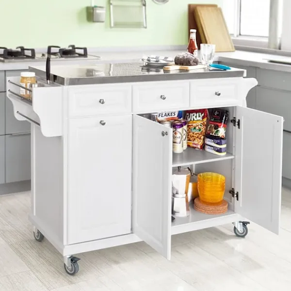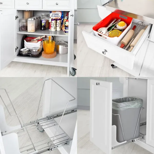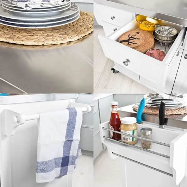 - Ingår 1 bänkskiva i rostfritt stål, 3 lådor, 1 förvaringsskåp i två våningar, 1 sopförvaringsskåp, 1 handdukstork, 1 sidoförvaringsställ och 4 hjul.