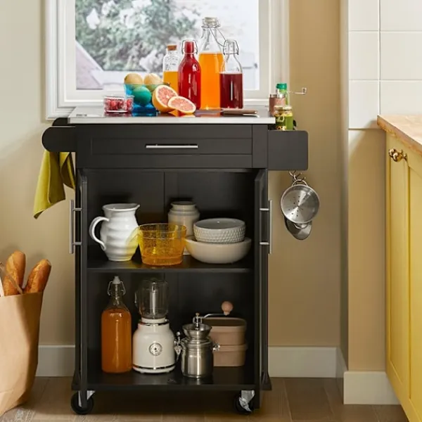 Denna vagns kompakta mått och funktionella design gör den idealisk för alla köksstorlekar. Använd den som en dryckesvagn, serveringsvagn eller mobil köksö för att förbättra ditt matlagnings- och underhållningsutrymme.