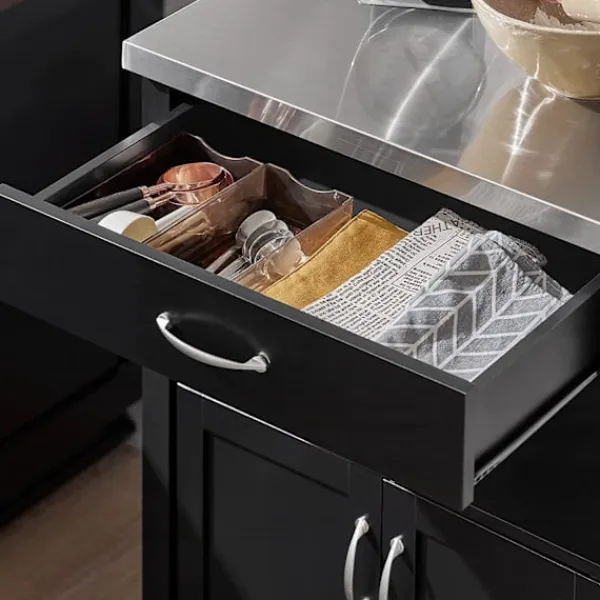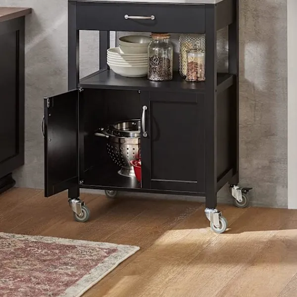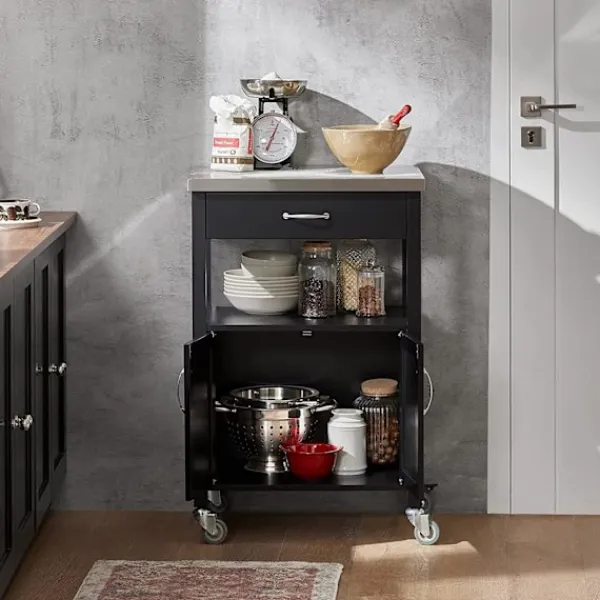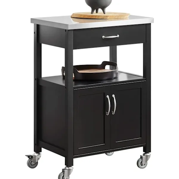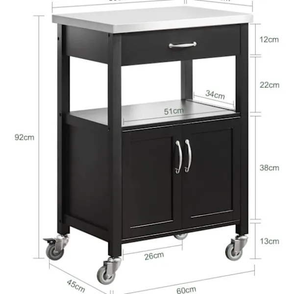 Detaljer: Detta köksskåp ger gott om förvaringsutrymme för olika redskap i ditt kök. Utrustad med bänkskiva i rostfritt stål, 1 låda, 1 öppen hylla, 1 skåp, 4 hjul (2 med broms). Det är inte bara ett vackert dekorativt tillbehör för ditt kök, utan också en idé att servera måltider direkt till dina gäster. Denna vagn är också idealisk för att placera en skrivare, filer och böcker på kontoret eller en kaffemaskin och koppar i terummet. Produktinformation Material: Trä, MDF. Svart färg. Mått: B60 x D44,5 x H91cm. Vikt: 20 kg. Lastkapacitet: 30 kg. Den kommer i en platt förpackning. Självmontering krävs. Detaljerade instruktioner medföljer. De dekorativa elementen ingår inte i leveransen. Vänligen kontakta oss via e-post när du har några frågor, vi svarar så snart som möjligt!
