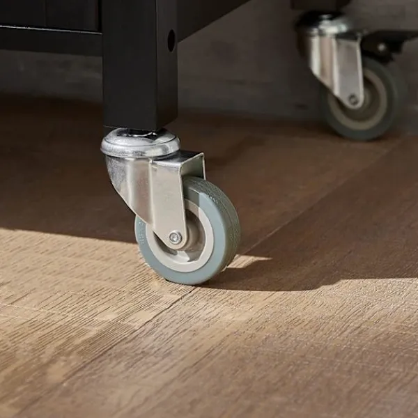 - Den har en låda, en öppen hylla, ett skåp och 4 hjul (2 med broms).