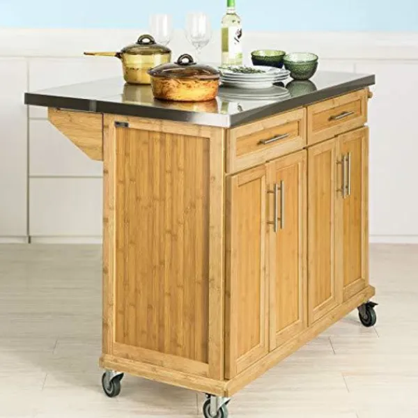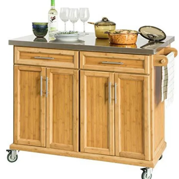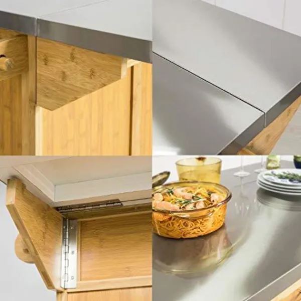 Detaljer: Denna moderna extraordinära köksvagn är designad för olika förvaringsutrymmen och hållbar användning. Den har en bänkskiva i rostfritt stål med breddad skiva, 2 lådor, 2 skåp med invändig justerbar hylla, 1 handduksställ och 4 hjul (2 med broms). Bänkskivan av god kvalitet MDF och rostfritt stål ger gott om plats att förvara och laga mat. Den fällbara sidobrädan kommer att lägga till ytterligare 25 cm till bänkskivans bredd. Med 4 hjul (2 hjul med bromsfunktion) kan du enkelt flytta runt vagnen i ditt kök. Med denna vagn skulle ditt hem bli mer stilfullt och rymligt. Produktinformation Material: Bambu, MDF, spånskiva, metall. Mått: B115 x D46/71x H92cm. Bänkskivans storlek: 107×46/71cm. Vikt: 37,5 kg. Lastkapacitet: 100 kg. Varan kommer i 2 platta förpackningar och kräver självmontering. Detaljerade instruktioner medföljer. Vi beklagar att vi inte kan garantera att båda paketen levereras samtidigt. Vänligen börja montera efter att båda förpackningarna har levererats. De dekorativa elementen ingår inte i leveransen. Vänligen kontakta oss via e-post när du har några frågor, vi svarar så snart som möjligt!