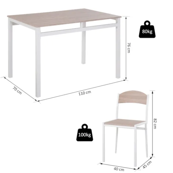– max. viktkapacitet: 80 kg (bord), 100 kg (per stol)