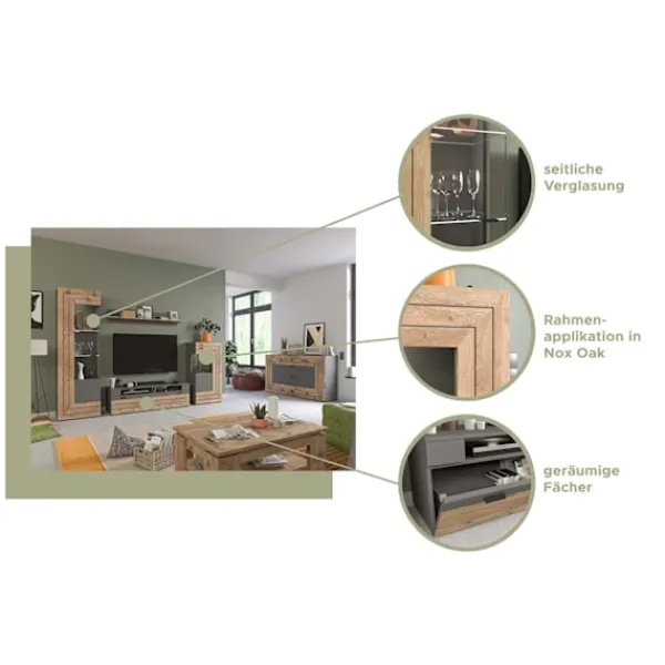 Uppgradera ditt bostadsutrymme med den mångsidiga rootz freno -skänket med en modern grå replikfront och kropp med en Nox Oak Replica -finish. Denna 160x90x40 cm skänk erbjuder 2 dörrar, 4 lådor och 4 hyllor för gott om lagringsutrymme. De fullständiga förlängningslådorna tillåter enkel åtkomst.