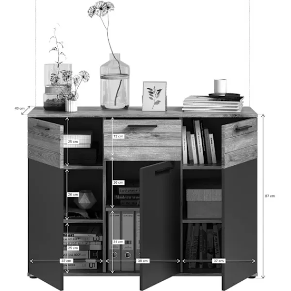 höj din lagringslösning med Rootz Mason -byrån. Denna träbräda och highboard combo, som mäter 120 x 87 x 40 cm, erbjuder gott om utrymme för att organisera dina väsentligheter samtidigt som du lägger till en touch av elegans till ditt utrymme.