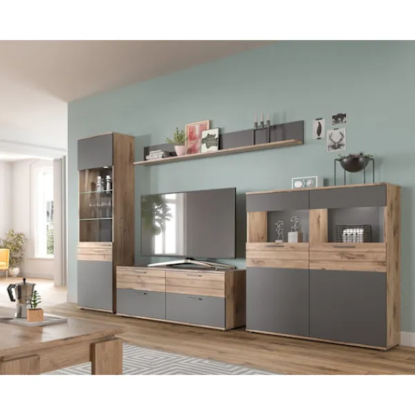 Tidlös design: Högkvalitativ och modern glasutställning i Basalt Gray och Nox Oak Replica som är lätt att ta hand om.