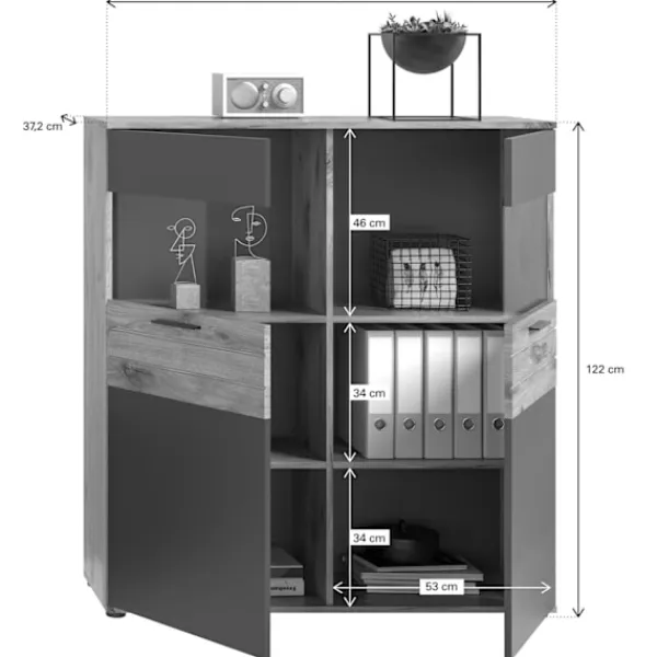 Möbler med system: 2 Glassdörrar, 4 hyllor och optimala förvaringslösningar för hem- eller kontor. Inställningar.