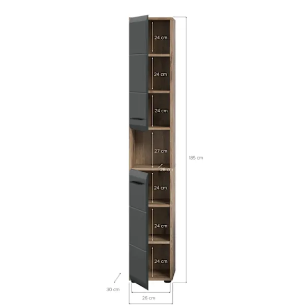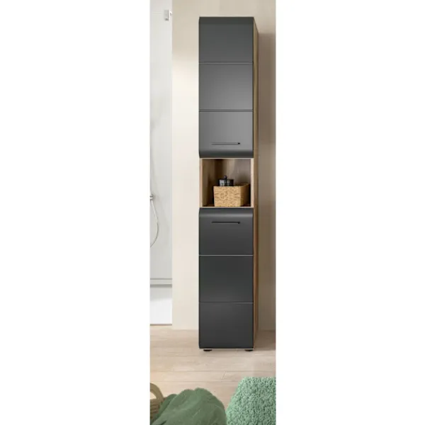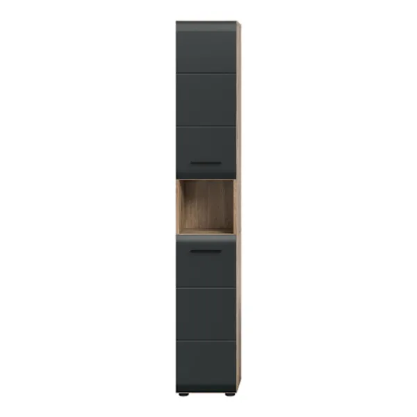 Förbättra ditt utrymme med det höga skåpet i svart och brunt. Detta eleganta skåp, med sin sofistikerade högkvalitativa MDF-front och spårfräsning, ger mångsidiga lagringslösningar. Den har två dörrar, fyra höjdjusterbara hyllor och rymliga fack, som kompletterar skandinavisk elegans med enkla vårdytor och enkel montering. Perfekt för samtida och elegant organisation.