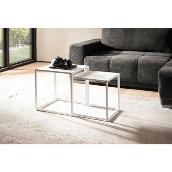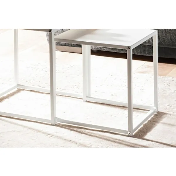 Höj ditt utrymme med Rootz Industrial Square Sidobord. Detta set innehåller två kapsbord i en matchande vit färgskala. Borden är designade med öppna ramar, vilket gör att det mindre kan passa under det större bordet, vilket ger en mångsidig stil. Det målade stålmaterialet säkerställer hållbarhet. Anti-halksnubbar skyddar dina golv och bibehåller bordens stabilitet. Använd dem tillsammans eller separat för att skapa en personlig inställning.