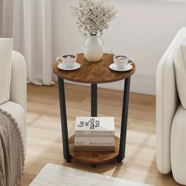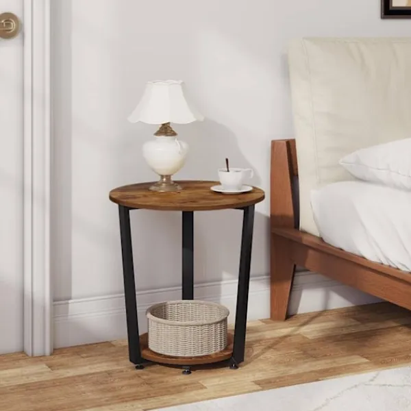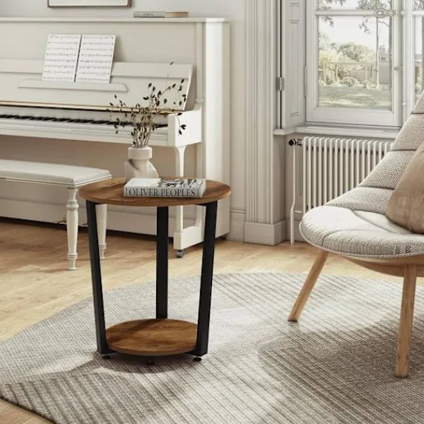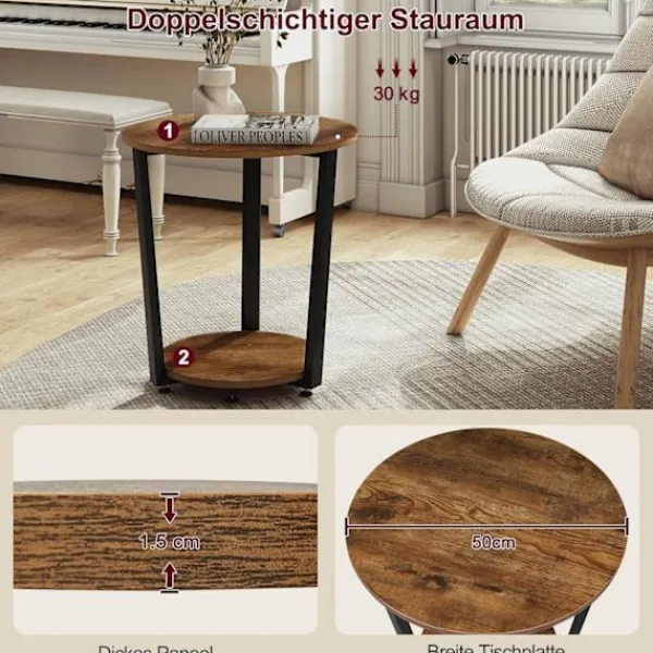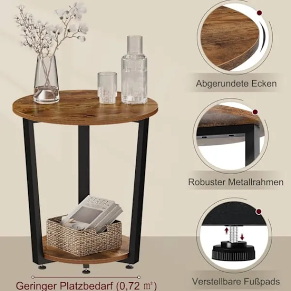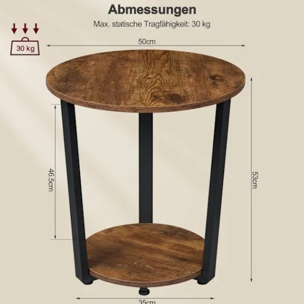 Rootz 2-hyllade runda sidobord är ett praktiskt och elegant komplement till din heminredning. Med två hyllor erbjuder detta lilla bord gott om förvaringsutrymme för olika föremål som vaser, böcker, lampor och mer. Den robusta metallramen och trämaterialet av E1-kvalitet säkerställer hållbarhet och stabilitet, som bär upp till 30 kg. Dess vintagedesign tillför elegans till alla rum, vilket gör det lämpligt att använda som soffbord i vardagsrummet, nattduksbordet eller växtbordet.