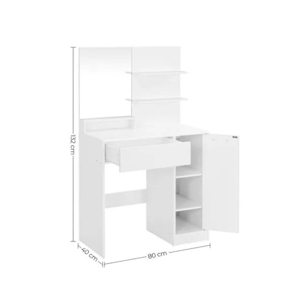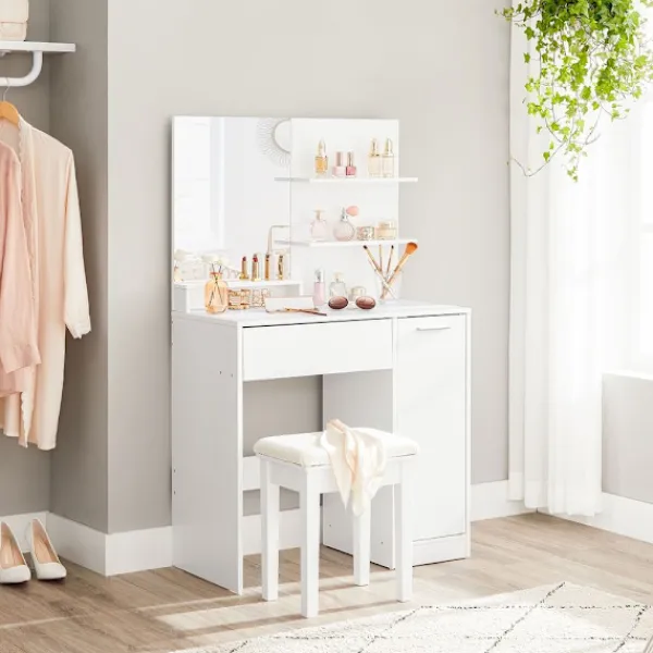 Detta sminkbord kommer att vara det rätta. Den vita färgen, den enkla bordsytan och den genomtänkta designen kommer definitivt att få ett leende på läpparna på dina vänner eller familj.