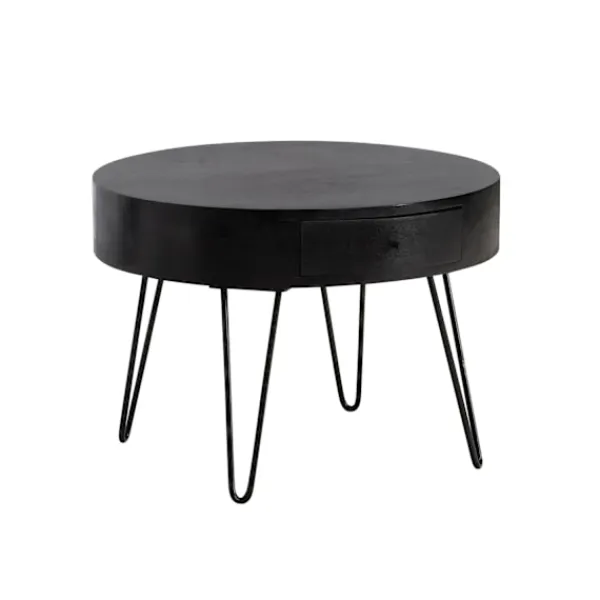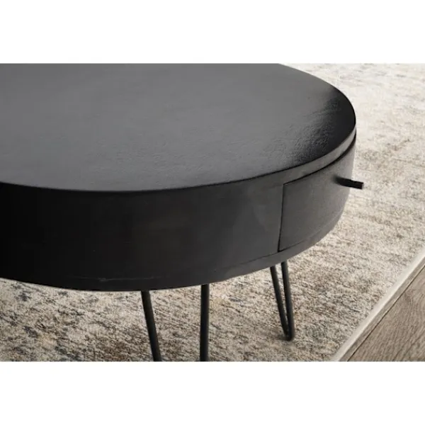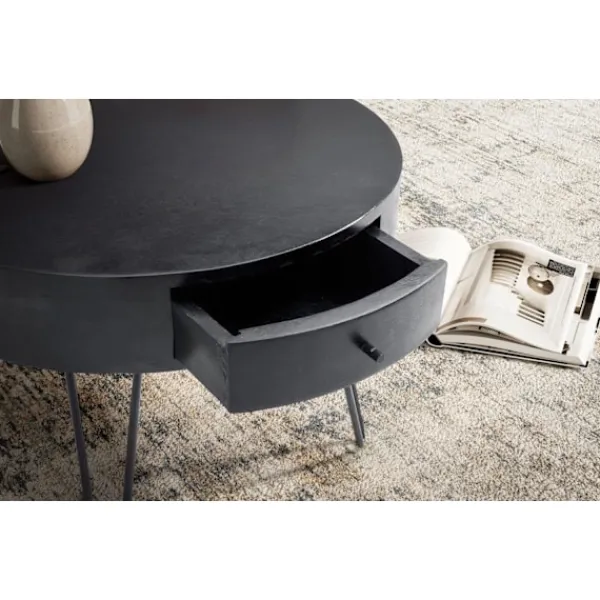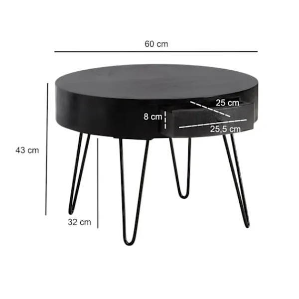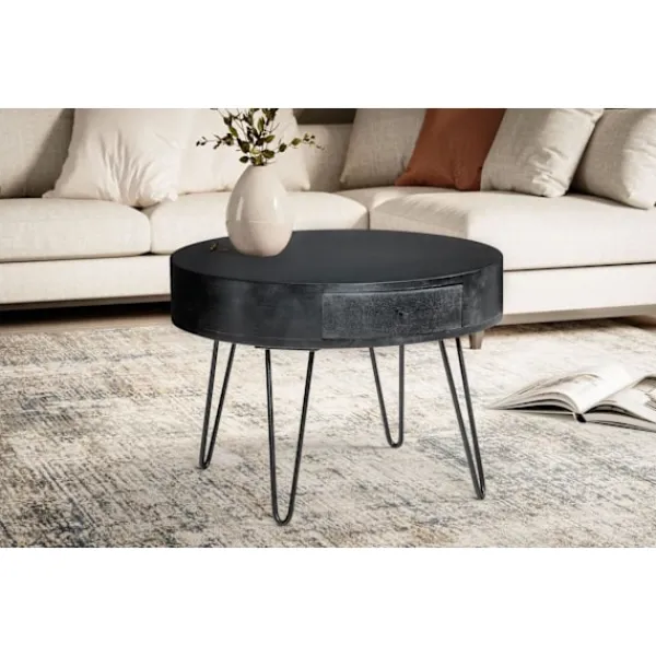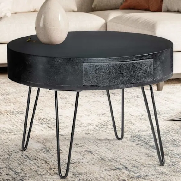 Ett modernt design soffbord med en rund bordsskiva för förvaring, en låda för ytterligare utrymme och eleganta hårnålben.