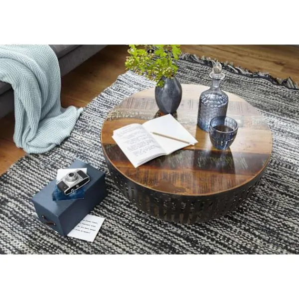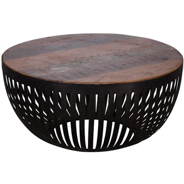 - Bordsskiva av mörkt och ljusbrunt trä på en svart metallkorg.