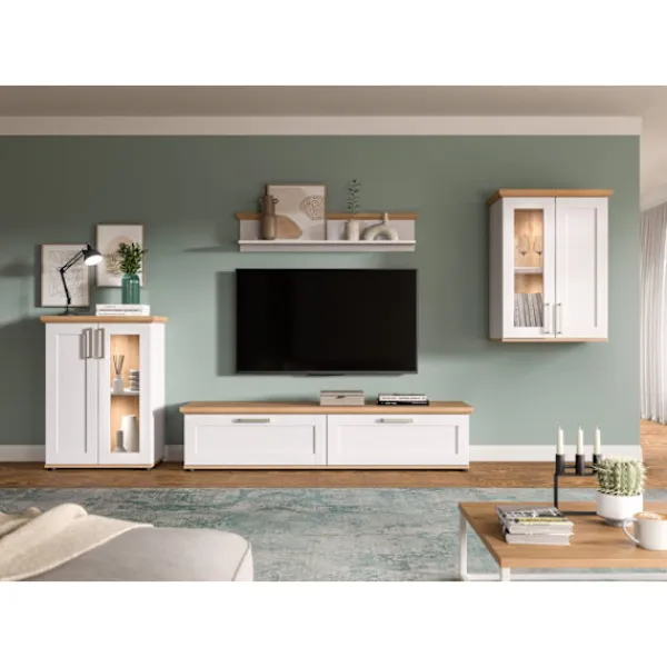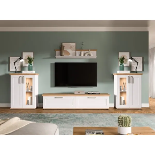 Upptäck rotz -vardagsrumskombinationen, perfekt för moderna utrymmen. Med en rustik lärkimiteringsfinish innehåller denna fyrdelade uppsättning två skärmskåp, en lågtavla och en vägghylla. Mätning av 336x161x40 cm erbjuder det gott om lagring och visningsutrymme. De kontrasterande topp- och bottenpanelerna förbättrar alla inre, vilket ger en mysig, organiserad atmosfär till ditt hem. Höj ditt vardagsrum med denna harmoniska, landshusstilensemble idag.