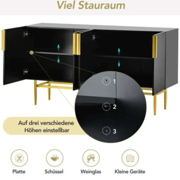 Tillräckligt med lagringsutrymme: En skänk med fyra dörrar erbjuder gott om lagringsutrymme. Dessutom kan de inre hyllorna justeras i tre olika höjder, som du kan justera eller ta bort efter behov. Tallrikar, skålar, vinglas eller små apparater av olika storlekar kan placeras på skänken. Den kan helt uppfylla dina förvaringsbehov, hålla allt organiserat och städa upp ditt hem.