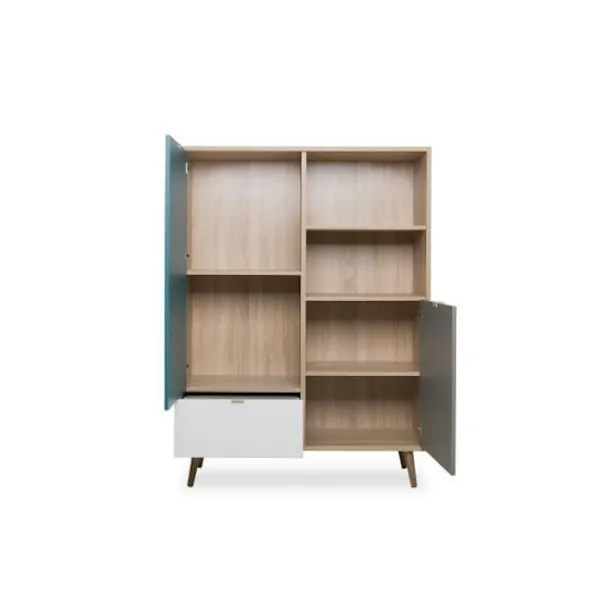 Den höga CUBA skänken är en praktisk och snygg förvaringslösning för dina porslin eller vardagsföremål. Med sina två luckor, sin låda och sina två nischer ger den optimalt förvaringsutrymme. De skandinaviska massiva träbenen och inslag av grått och bensinblått ger en trendig touch till denna moderna vardagsrumsmöbel.