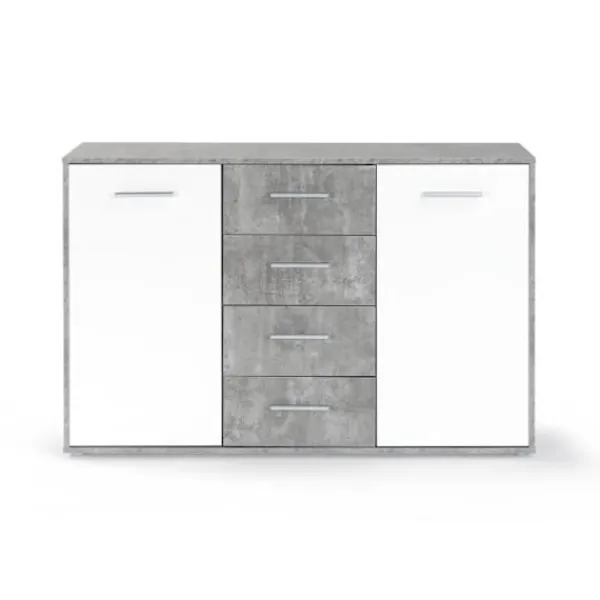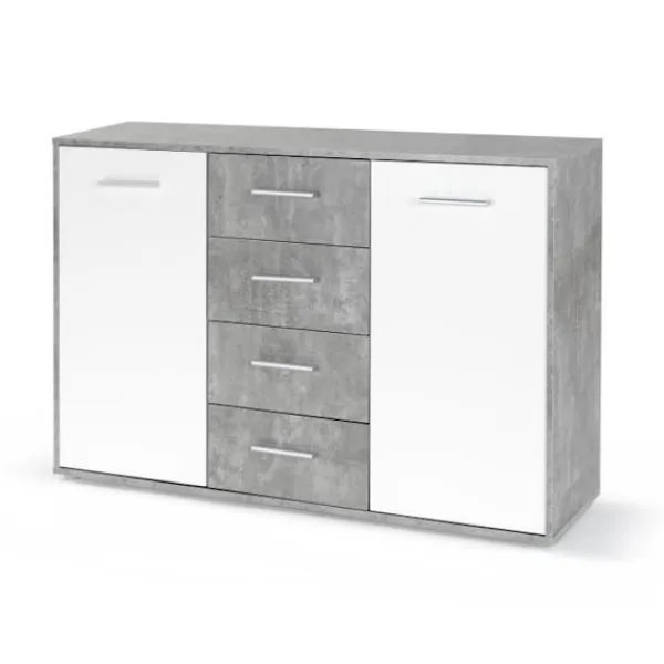 Låg skänk PILVI är en vardagsrumsmöbel med modern och modern design. Den här skänken består av två stora dörrar med 2 hyllor och 4 lådor gömda bakom dem och erbjuder dig gott om förvaringsutrymme för ditt porslin eller till och med ditt bordslinne. Dess mått är L 122,6 x D 34,2 H 88,1 cm och dess finish är blank.