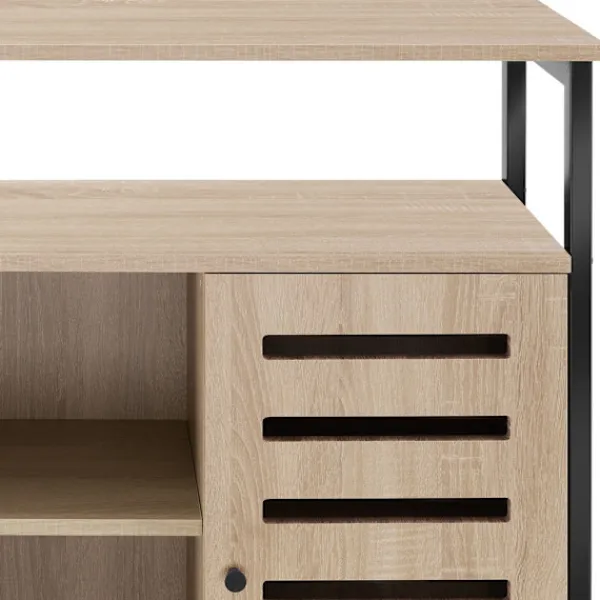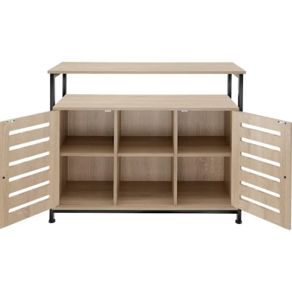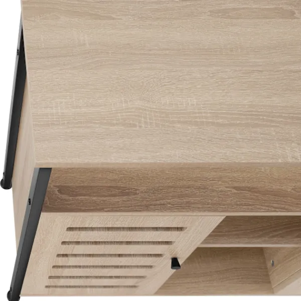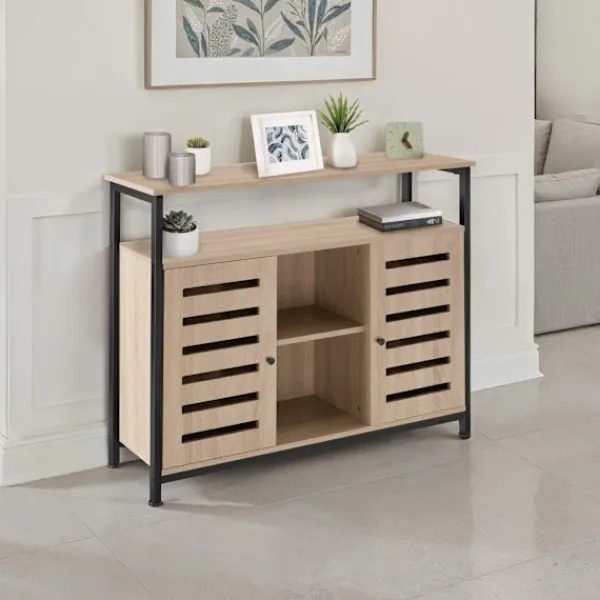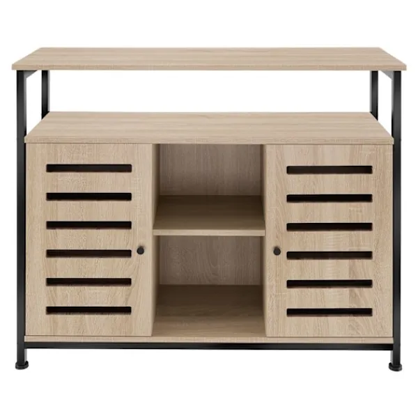 Om du uppskattar attraktiva kontraster och en tydlig design är det mångsidiga Warrington-sidobordet från tectake ett måste för ditt hem. Den svarta stålramen, den naturtrogna träimitationen och de moderna linjerna skapar en imponerande estetik med en iögonfallande industriell stil. Skåpet har 2 hyllor, 2 skåpsfack och en öppen mittsektion som erbjuder både en rymlig presentationsyta och gott om förvaringsutrymme. Den höga funktionaliteten är typisk för denna puristiska möbelstil, med lättstängda magnetdörrar, justerbara hyllplan och exakta justerbara skruvfötter.