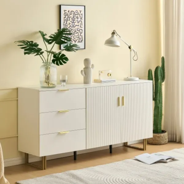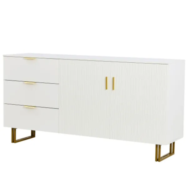 Skänken har tre lådor på vänster sida, perfekta för förvaring av mindre föremål som bestick, servetter eller accessoarer. På höger sida finns två dörrar, bakom vilka det finns ett rymligt förvaringsfack med flera hyllor, idealiskt för tallrikar, koppar eller andra köksredskap. Den tidlösa vita designen harmoniserar med guldhandtagen och de bruna benen, vilket gör skänken till en mångsidig möbel för alla hem. Den fungerar utmärkt som buffé i matsalen eller som praktisk förvaring i vardagsrummet.