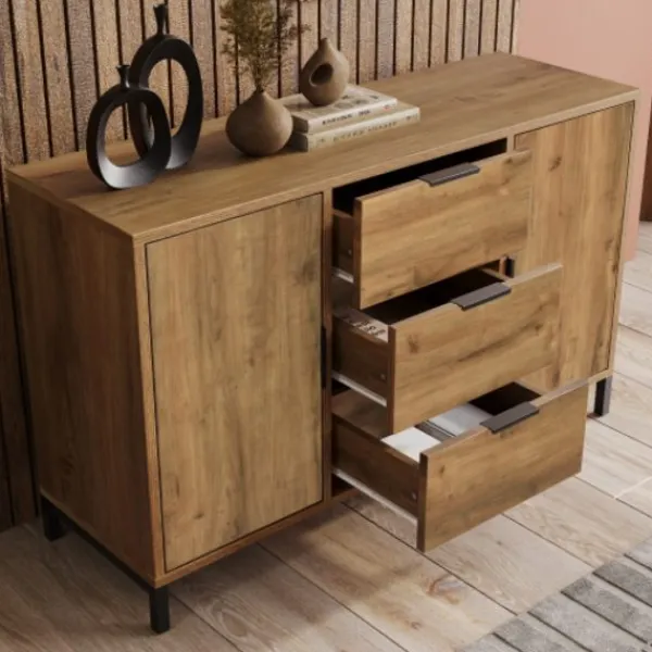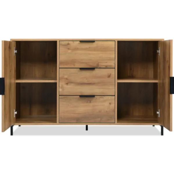 Tidlös ekestetik passar alla hus: Kuben är utrustad med ett rustikt träutseende, som tillsammans med den svarta metallramen säkerställer en verkligt industriell design av lådorna. Detta otvivelaktigt rustika utseende passar särskilt bra till traditionella och bekväma lägenheter, medan de ytterligare elementen av eleganta svarta handtag bidrar till dess sömlösa integration i moderna rum.