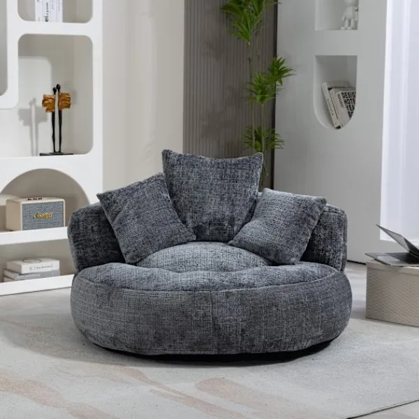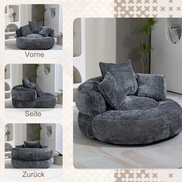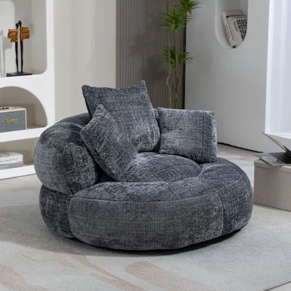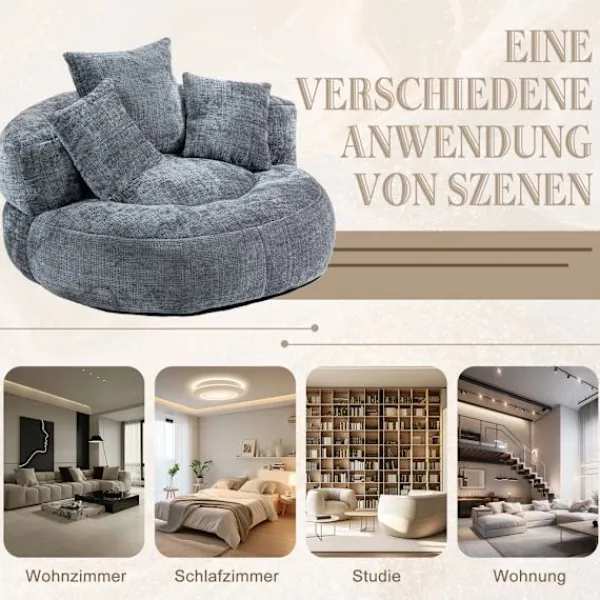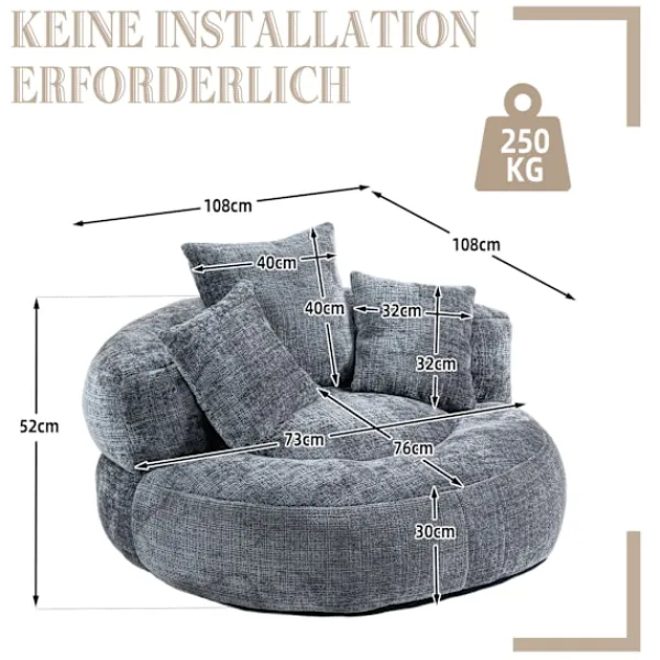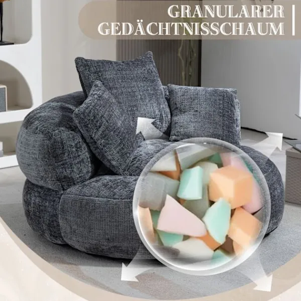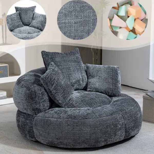 Rymlig ergonomisk lat stol med omslutande ryggstöd, böjda armstöd och en bred vadderad sits för komfort hela dagen. I vuxenstorlek och konvertibel, den fungerar som en loungestol, golvsoffa eller gästsäng för vuxna, tonåringar och barn. Chenilletyg, skumstruktur och 150 kg kapacitet; ingen montering behövs, perfekt för vardagsrum, sovrum eller spelområde.
