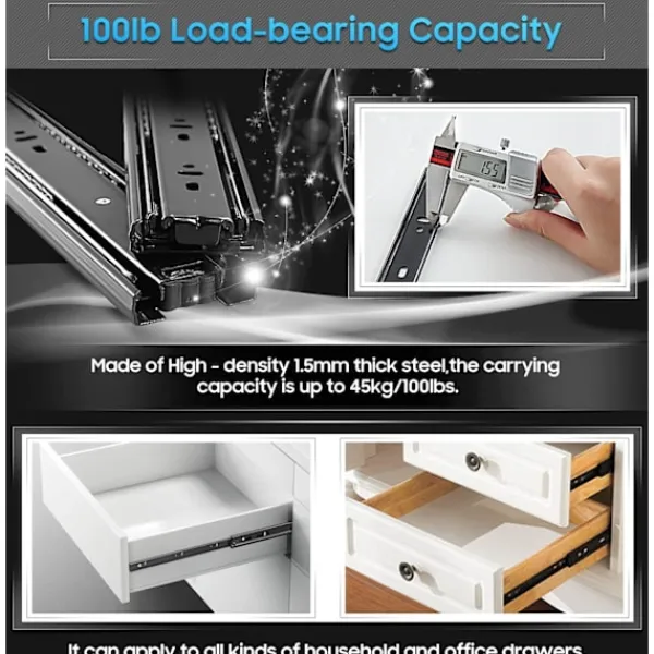Maximal belastningskapacitet: 100 lbs |: Skenorna är tillverkade av 1,5 mm kallvalsad stålplåt med hög densitet, vilket håller lådorna stabila och säkra även när de bär laster upp till 100 lbs.