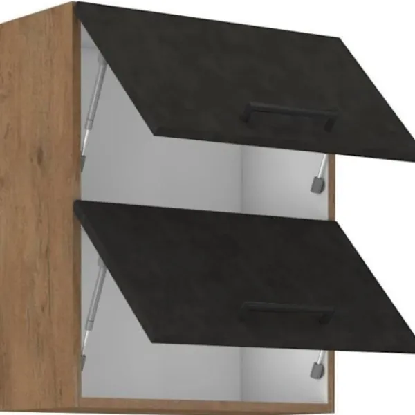 Satsa på det höga köksskåpet ROCK 60 cm långt med 1 vippdörr. Dess matta finish och huvudgrå färg harmoniserar perfekt med lådorna och den övre delen av fasaderna i Lancelot ekimitation. Strukturen i 16 mm melaminspånskiva med Lancelot ek och Matera grå dekor är solid och hållbar.