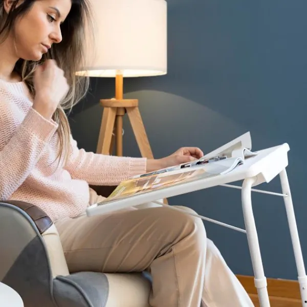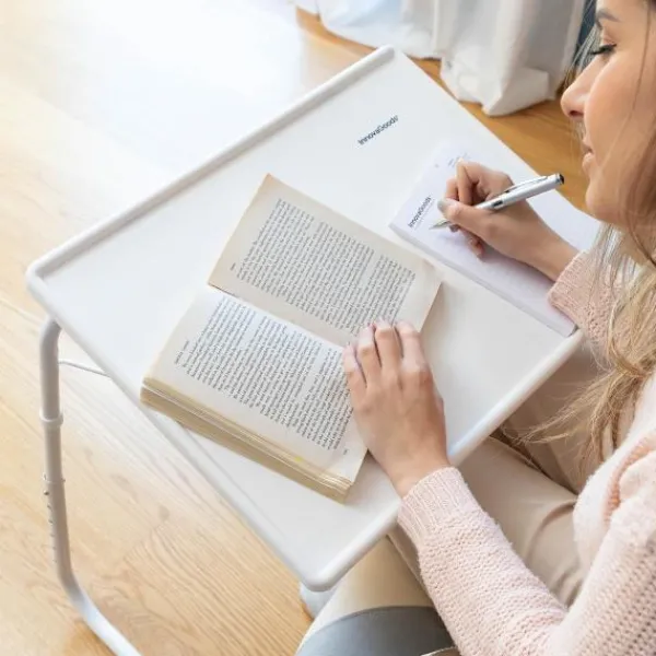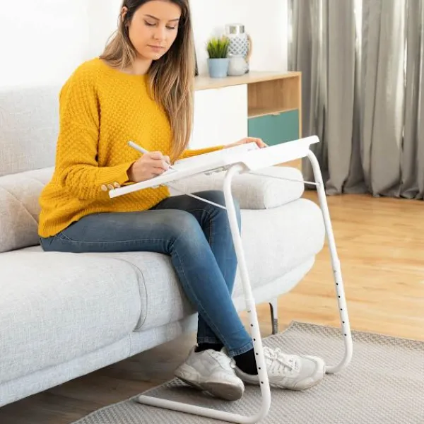 Detta hopfällbara bord ger dig en stabil bordsyta oavsett var du sitter – i soffan, i sängen eller någon helt annanstans. Höjden är justerbar i 6 positioner mellan 47 och 70 cm, och du kan dessutom luta bordsskivan i 3 vinklar. En användbar funktion när du arbetar vid en bärbar dator, skriver eller ritar. När du inte använder bordet kan du fälla ihop det för enkel förvaring.- Ett bort med många användningsområden- Justerbar höjd och flera vinklar- Hopfällbart för enkel förvaringSpecifikationer:Färg: VitMaterial: Metall, plastMått: ca. 53 x 39 x 70 cmMått, förpackning: ca. 54 x 42 x 7 cmJusterbar höjd: 47-70 cmAntal vinklar: 3Maxvikt: 2 kgFörpackningen Innehåller:1x Bord