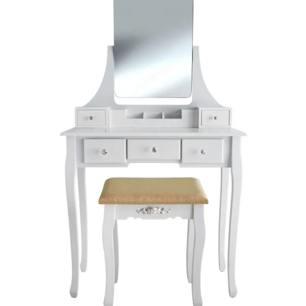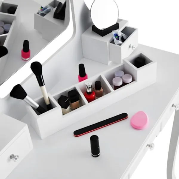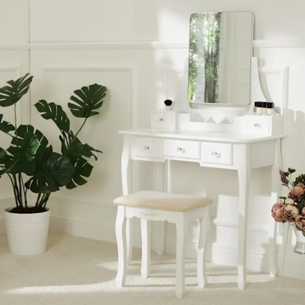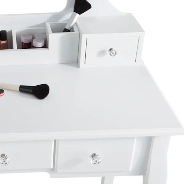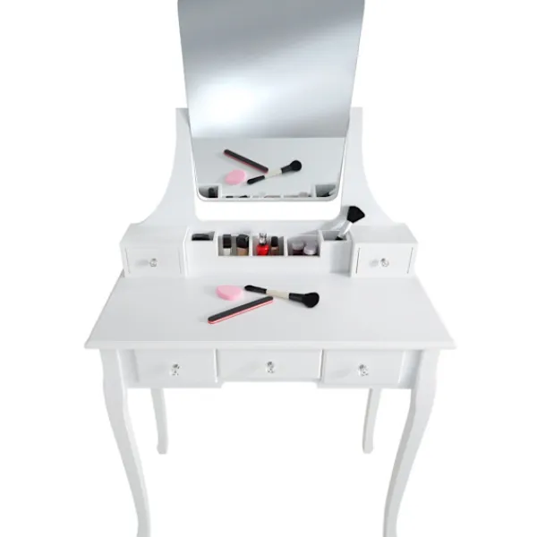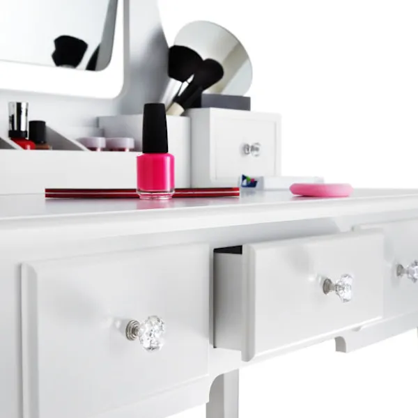 Starta en vacker dag med ett vackert utseende tack vare det moderna och eleganta sminkbordet Claire från tectake. Framför den stora och helt svängbara spegeln är varje make-up och varje frisyr framgångsrik. I de fem lådorna och i det avtagbara facket för smink har du alltid alla redskap redo att användas, från borstar och parfym till nagellacksborttagare . Den solida konstruktionen gjord av MDF-brädor och furuträ garanterar långvarig njutning i denna personliga skönhetssalong från tectake.