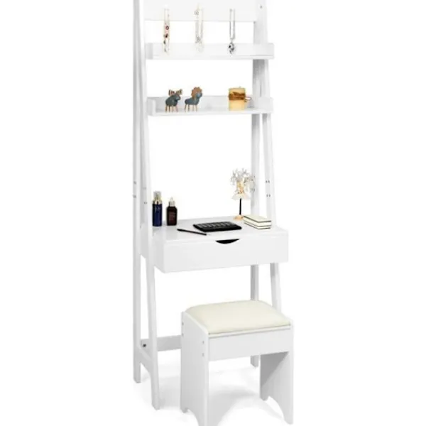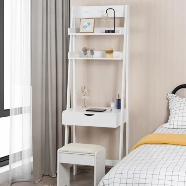 Detta sminkbord av hög kvalitet i MDF har flera hyllor och en högupplöst spegel för en bredare vy när du kollar din makeup. Den uppfällbara designen gör att den kan förvandlas till ett skrivbord eller skrivbord på några sekunder, samtidigt som den fungerar som en enkel liten bokhylla och nattduksbord.