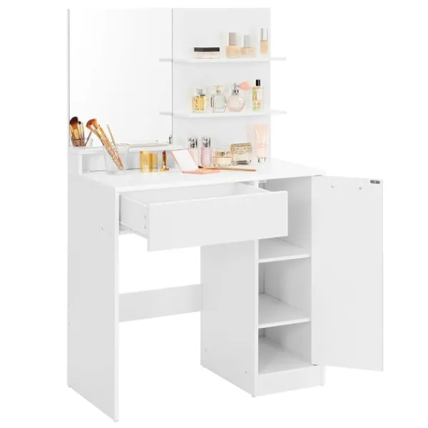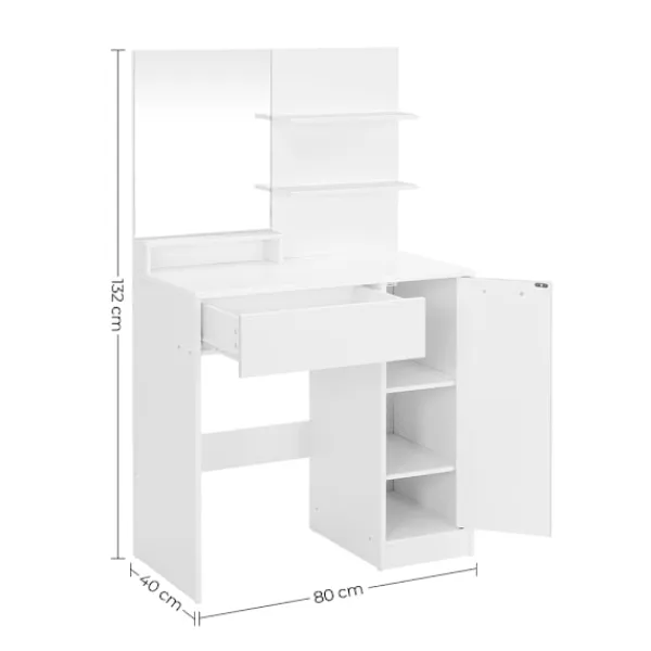 Det här sminkbordet med spegel är en perfekt kombination av stil och funktionalitet. Med gott om förvaringsutrymme och en ramlös spegel skapar det en inbjudande plats för din dagliga skönhetsrutin. Placera smink, borstar och hudvårdsprodukter på de lättåtkomliga hyllorna eller i det rymliga förvaringsskåpet, och håll din makeupstation organiserad och prydlig.