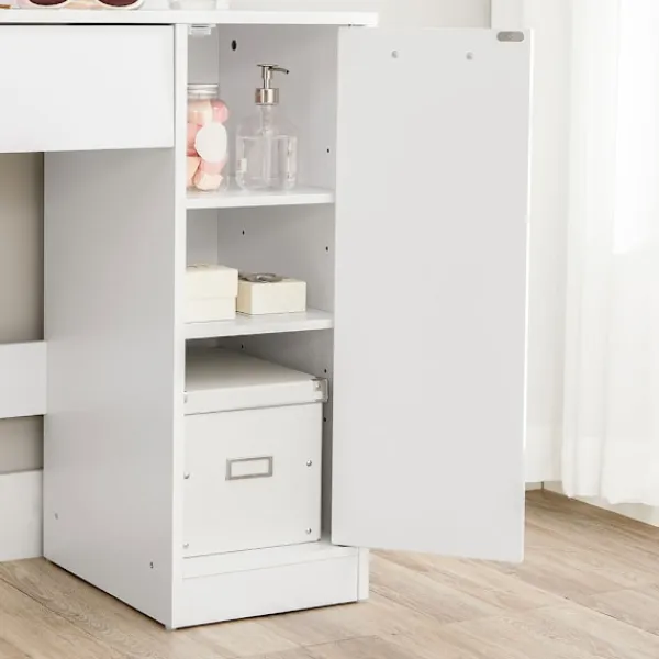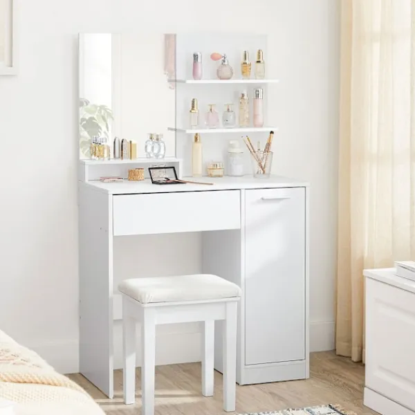 Med en rymlig låda för sminkborstar och ögonskuggor, två öppna hyllor för favoritprodukterna och ett skåp för större flaskor och burkar, blir det enkelt att hålla ordning. Det gör att du kan fokusera på din morgonrutin utan stress och alltid ha dina skönhetsprodukter nära till hands.