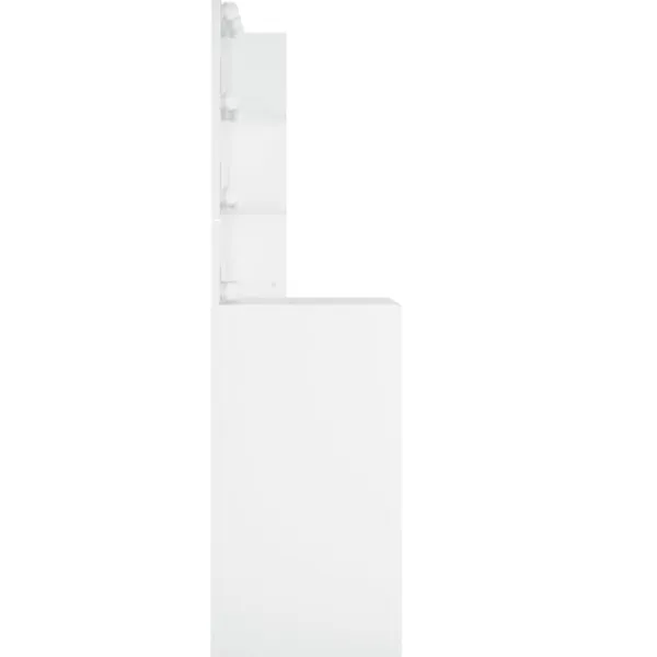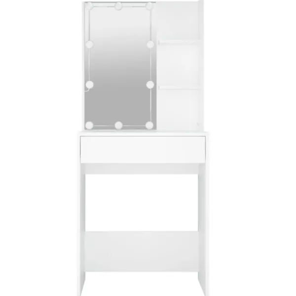 Detta sminkbord kommer att bli ett riktigt blickfång i din inredning, tack vare sina raka linjer och asymmetriska form. Slitstarkt material: Trämaterialet är av exceptionell kvalitet med en slät yta och är även starkt, stabilt och fuktbeständigt. LED-belysning: Sminkbordet har även USB LED-lampor, som är lätta att växla från varmt till kallt vitt. LED-lamporna runt spegeln avger ljus. Gott om förvaringsutrymme: Den rymliga lådan och de två öppna hyllorna erbjuder tillräckligt med förvaring för att organisera dina saker och även göra ditt rum snyggt och prydligt. VARNING: För att förhindra att den välter måste denna produkt användas med den medföljande väggmonteringsanordningen. Obs: Varje produkt levereras med en monteringsmanual i lådan för enkel montering.