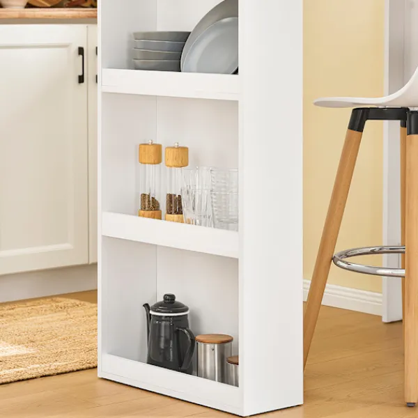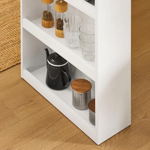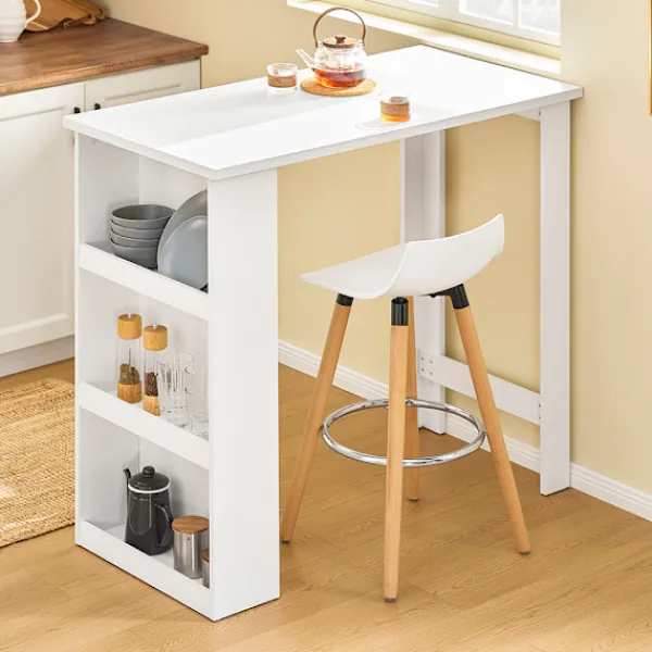 Denna kompakta köksö erbjuder en smart och rymdskapande lösning för moderna hem. Med sitt integrerade designkoncept kombinerar den ett praktiskt köksbord med praktiska sidohyllor, vilket gör den idealisk för lägenheter, kök, vardagsrum och hemmakontor. Den fungerar utmärkt som både kökshalvö och barbord, särskilt i mindre utrymmen där varje centimeter räknas. Bordets tredelade förvaringshyllor ger gott om plats för tallrikar, glas och köksredskap, vilket håller allt organiserat och lättillgängligt. Oavsett om du använder det som frukostbord, serveringsyta eller för små sammankomster, skapar det en elegant och funktionell miljö. Ytterligare flexibilitet ges genom den tvåsidiga monteringen, som kan justeras till vänster eller höger efter behov. Med tydliga och enkla monteringsanvisningar sätts bordet snabbt upp, redo att tjäna som bistrobord, köksbord eller smalt konsolbord – en snygg och praktisk möbel som passar i alla hemmiljöer.