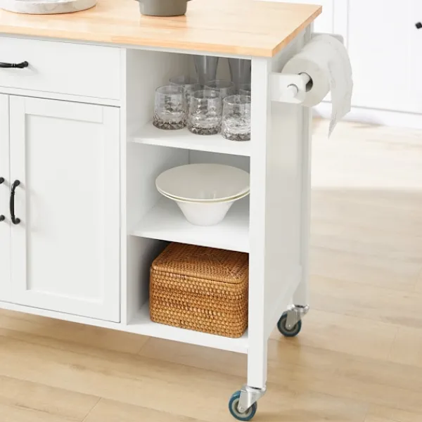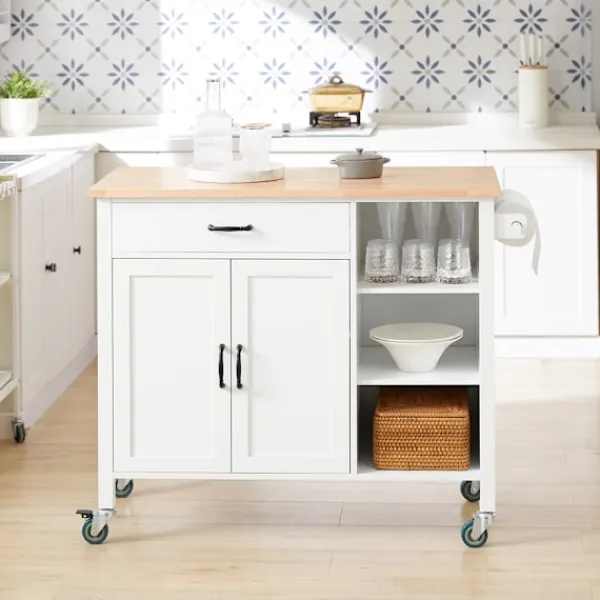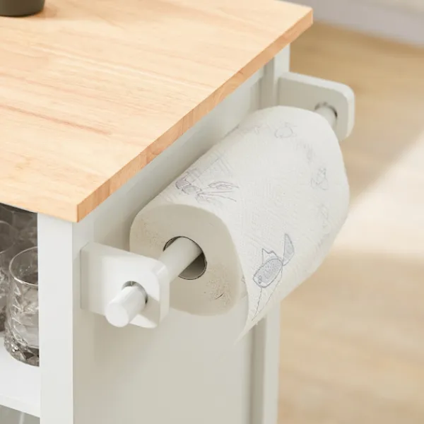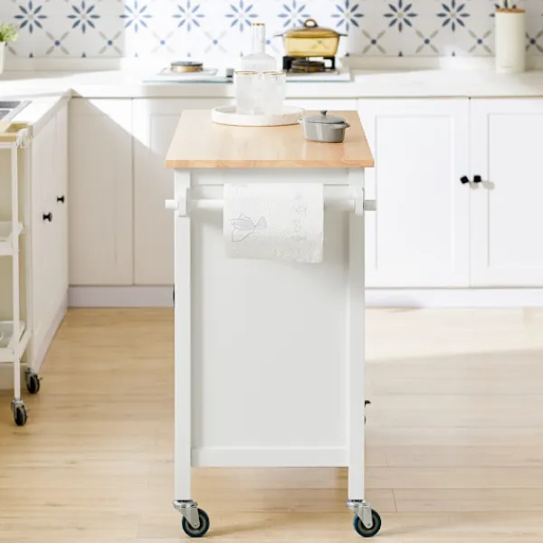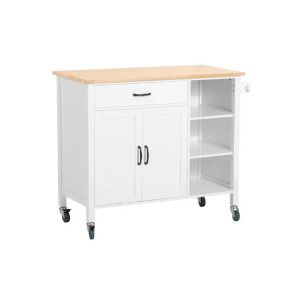 Den här multifunktionella köksvagnen är utrustad med en praktisk låda, ett skåp med dörr och tre hyllor – perfekt för att organisera dina kökstillbehör. Den ger inte bara värdefullt extrautrymme utan erbjuder även en stabil arbetsyta för matförberedelse. Den smarta handdukshållaren på toppen fungerar samtidigt som ett bekvämt handtag när du behöver flytta vagnen.