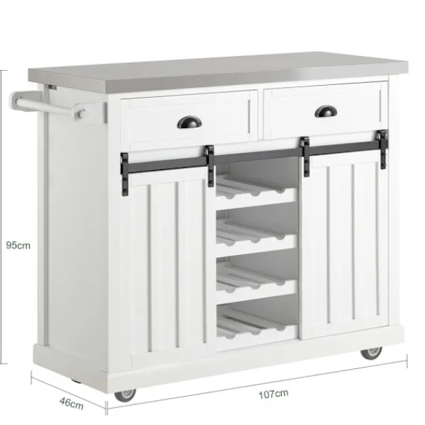 Denna köksvagn är den perfekta lösningen för ett bättre organiserat kök. Den rostfria bänkskivan erbjuder ett hygieniskt och lättrengjort arbetsområde för matlagning, medan de olika förvaringsalternativen – från stängda skåp till öppna hyllor – ger plats åt allt från köksredskap till vinflaskor. Den funktionella designen med integrerat handtag gör vagnen lätt att flytta runt i köket efter behov. Enkel att montera och tillverkad för hållbar användning i hemmet.