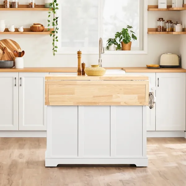 En särskilt praktisk funktion är det fällbara sidoskåpet som förlänger arbetsytan, vilket skapar extra plats för matlagning och servering. Detta är idealiskt i mindre kök eller köksöar. Med de fyra dolda hjulen kan du enkelt flytta hela enheten för att optimera köksorganisationen efter behov.