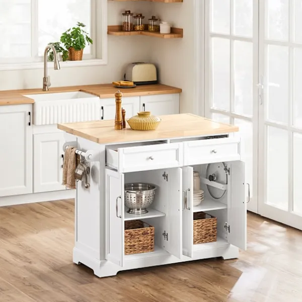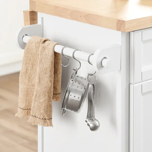 Förvaringen är flexibel och omfattande. De två utdragbara lådorna och skåpen med dubbeldörrar ger gott om utrymme. Inuti skåpen finns U-formade stänger, perfekta för att hänga lock, och på sidan finns ett handduksställ med S-krokar för köksredskap. De långa handtagen i europeisk stil gör allt lättillgängligt.