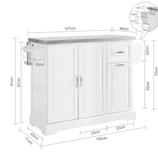 Denna moderna köksö erbjuder ett brett och välordnat förvaringsutrymme, perfekt för att organisera köksredskap och förbrukningsvaror. Den kompakta men utbyggbara designen gör den idealisk för mindre kök eller som platsbesparande extra arbetsyta. Med sina utdragbara lådor och generösa lastkapacitet fungerar den utmärkt både som stationär enhet och rörlig köksvagn.