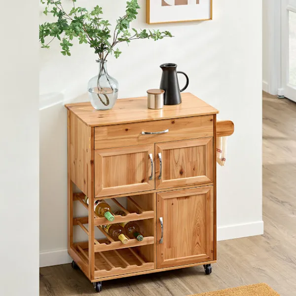 SoBuy platsbesparande köksvagn i massivt granträ är ett multifunktionellt skåp för kök och matsal. Smart förvaring och elegant design.